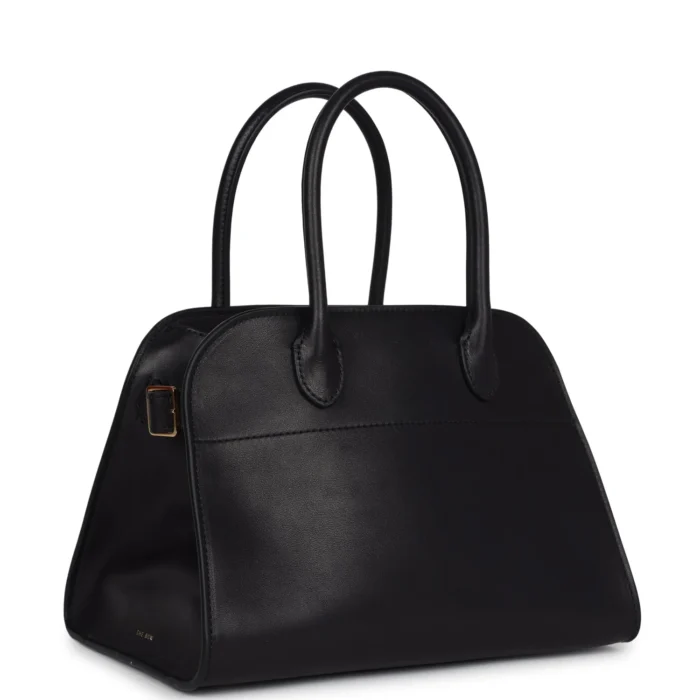 The Row Margaux 10 bag in premium black saddle leather with gold-tone hardware, combining understated style with superior craftsmanship. A must-have for luxury handbag collectors and minimalist fashion enthusiasts.