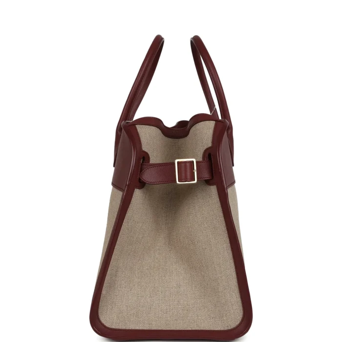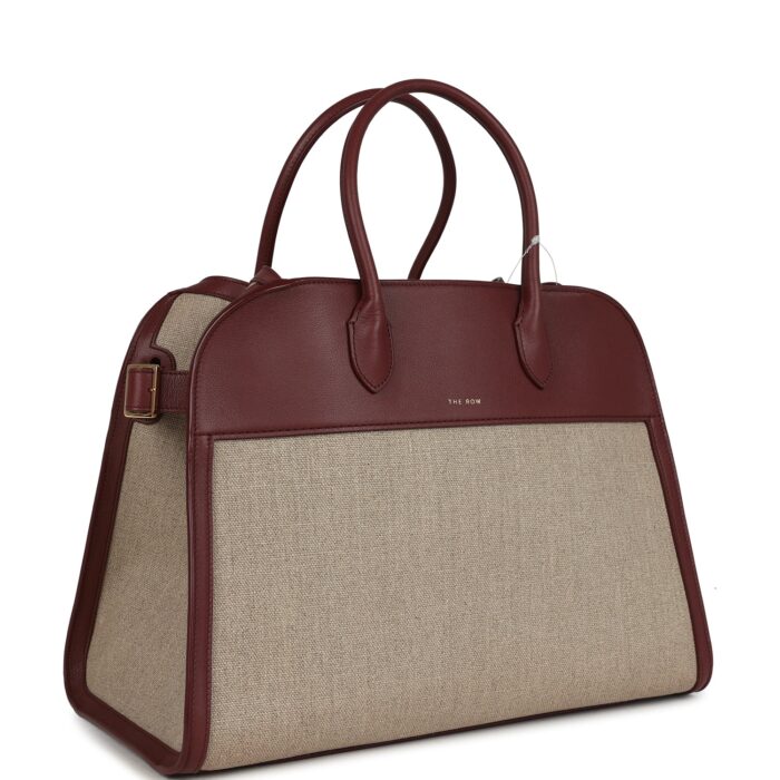 Elevate your wardrobe with The Row Soft Margaux 15 in a rich burgundy hue. This timeless luxury tote features smooth calfskin leather paired with natural canvas, complemented by elegant gold hardware. Its spacious silhouette and structured design make it perfect for both daily use and sophisticated outings. Crafted with precision and understated elegance, this piece reflects The Row’s signature minimalist aesthetic.
