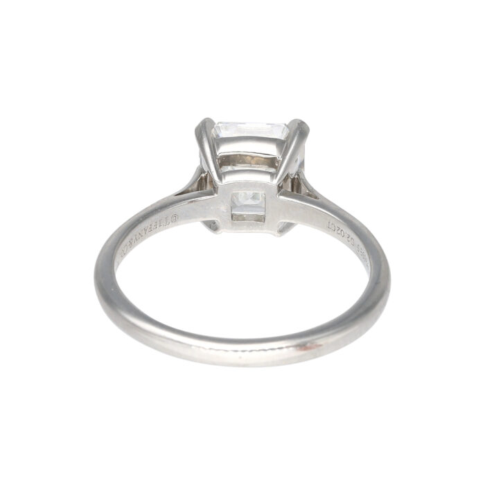 A certified Tiffany & Co. engagement ring showcasing a 2.02ct F/VS2 square emerald cut diamond set in platinum. Signed with serial, size 5¼, accompanied by Tiffany’s certificate