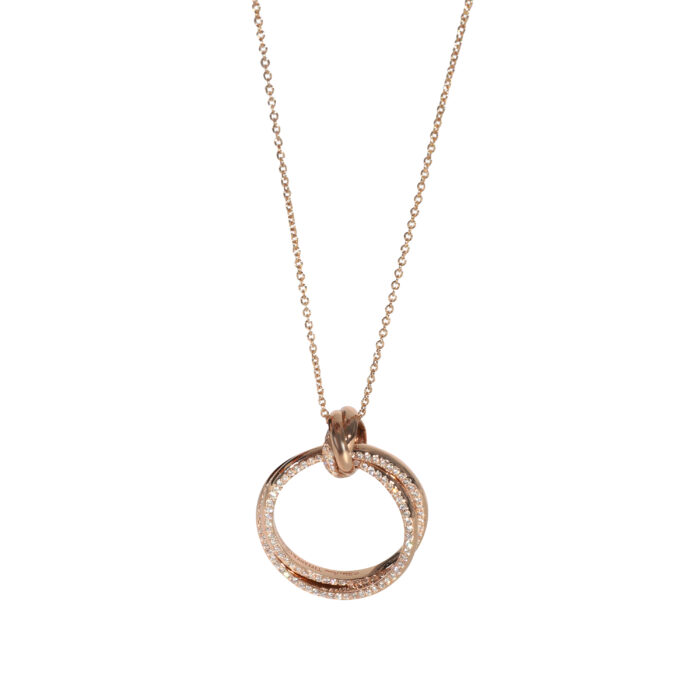 Discover timeless elegance with this Tiffany & Co. Rose Gold and Diamond Melody Pendant Necklace. Part of the iconic Paloma Picasso Melody Collection, this piece features two larger interlocking rings gracefully connected by a bale, which holds three smaller interlocking rings — all adorned with round brilliant-cut diamonds totaling approximately 0.40 carat.