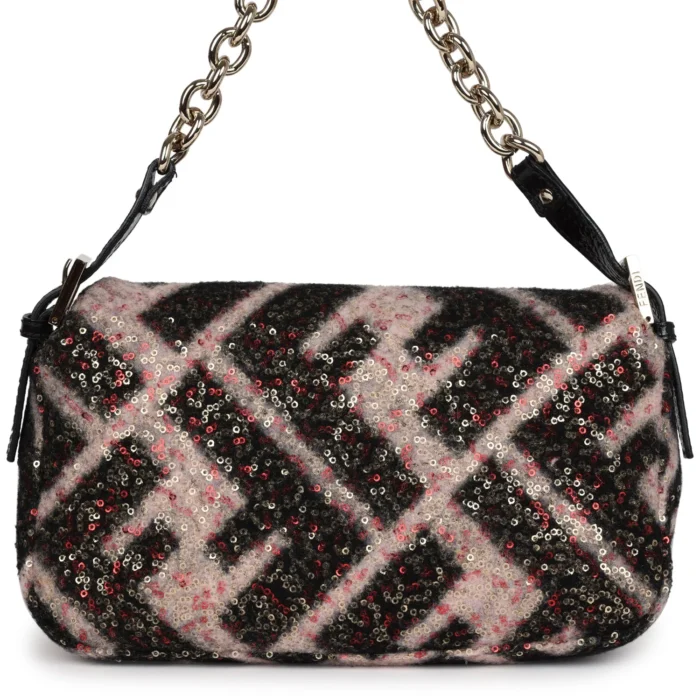 This authentic Vintage Fendi shoulder bag features the iconic Zucca print in a striking pink and black wool blend, accented with shimmering sequins and light gold hardware. A rare collector’s item, it offers both timeless elegance and standout style. Perfect for evening outings or elevating a casual look, this piece reflects Fendi’s signature craftsmanship and bold design.